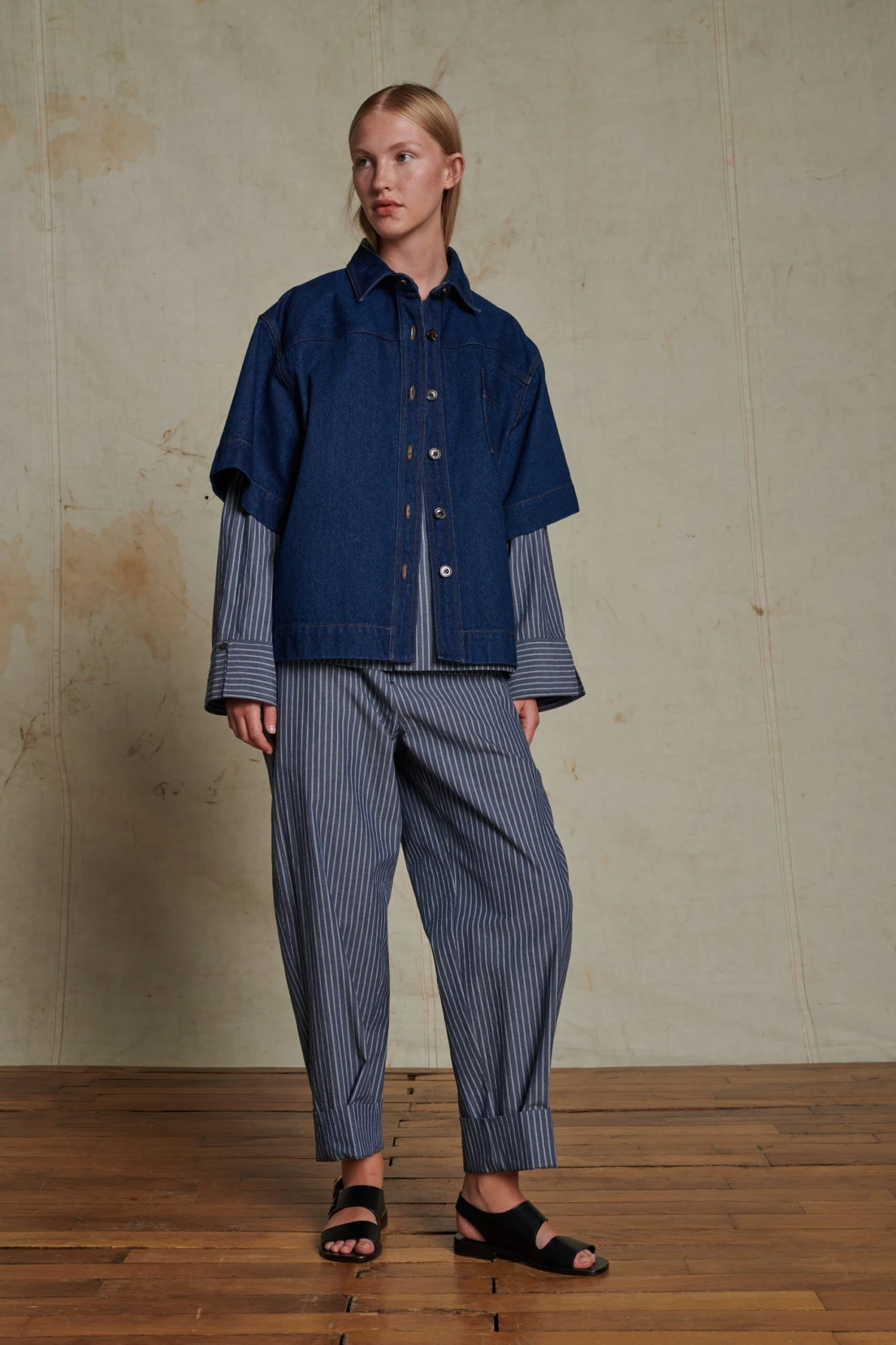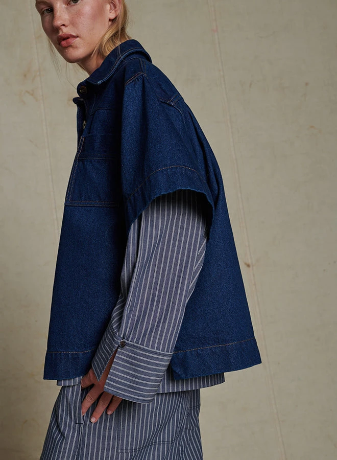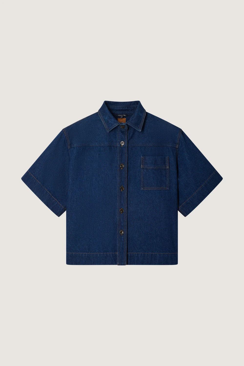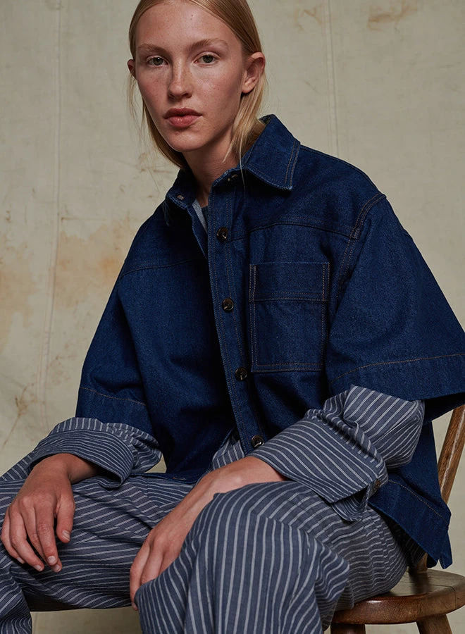 ANTOINETTE est une chemisette en toile de denim Ă©paisse, assouplie grâce Ă un lavage qui conserve sa couleur dense bleu indigo. Son volume ample permet de la porter aussi bien en surchemise qu’Ă mĂŞme la peau.