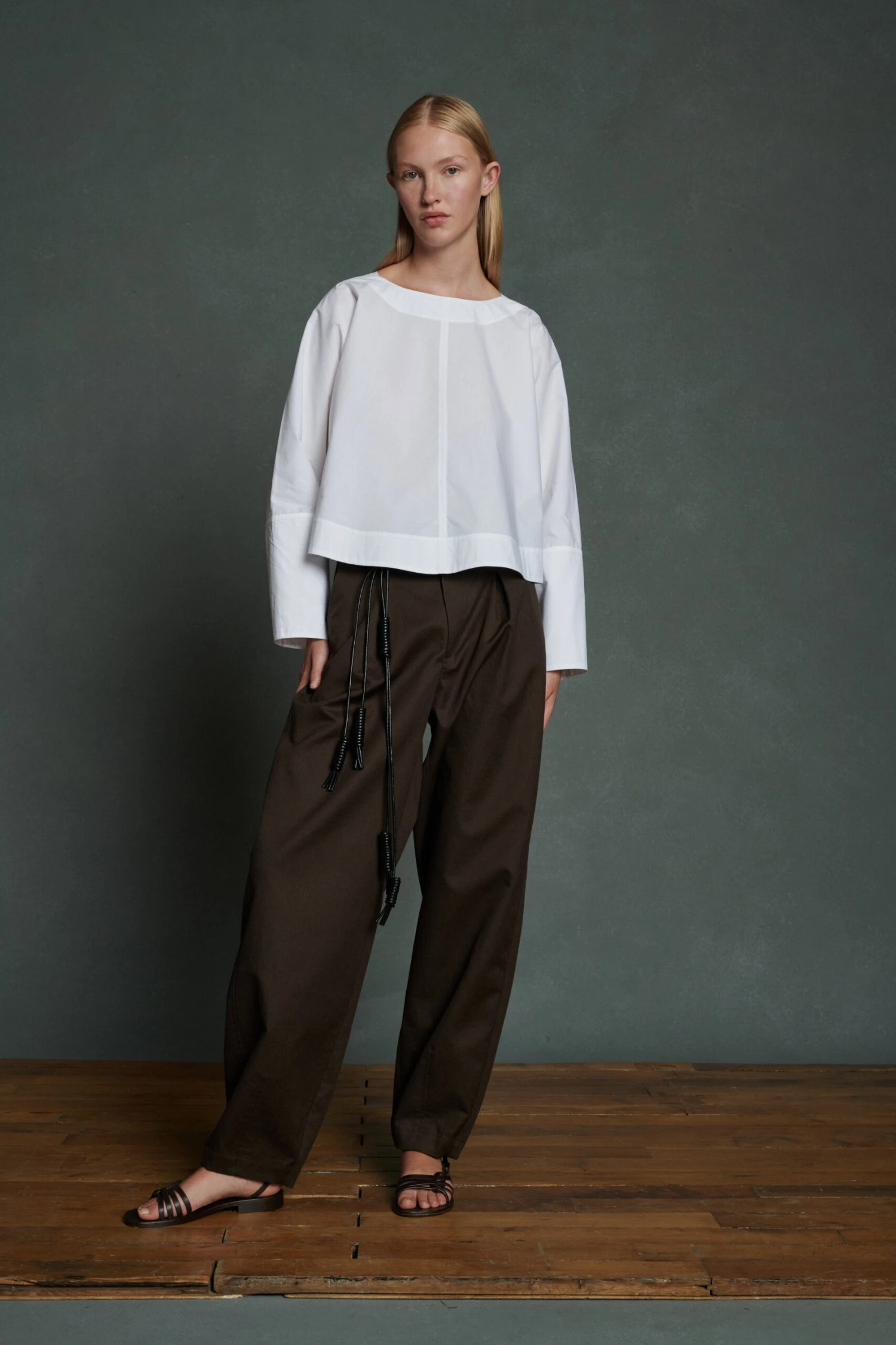 ARMAND est une blouse en coton aux lignes épurées. Son volume ample et sa coupe trapèze accentuent l’effet court et suspendu au-dessus de la taille. Le bas de corps, le col et les manches sont doublés, créant un jeu de transparence contrasté. A porter sur un pantalon taille haute ou en superposition sur une blouse ou une robe longue.