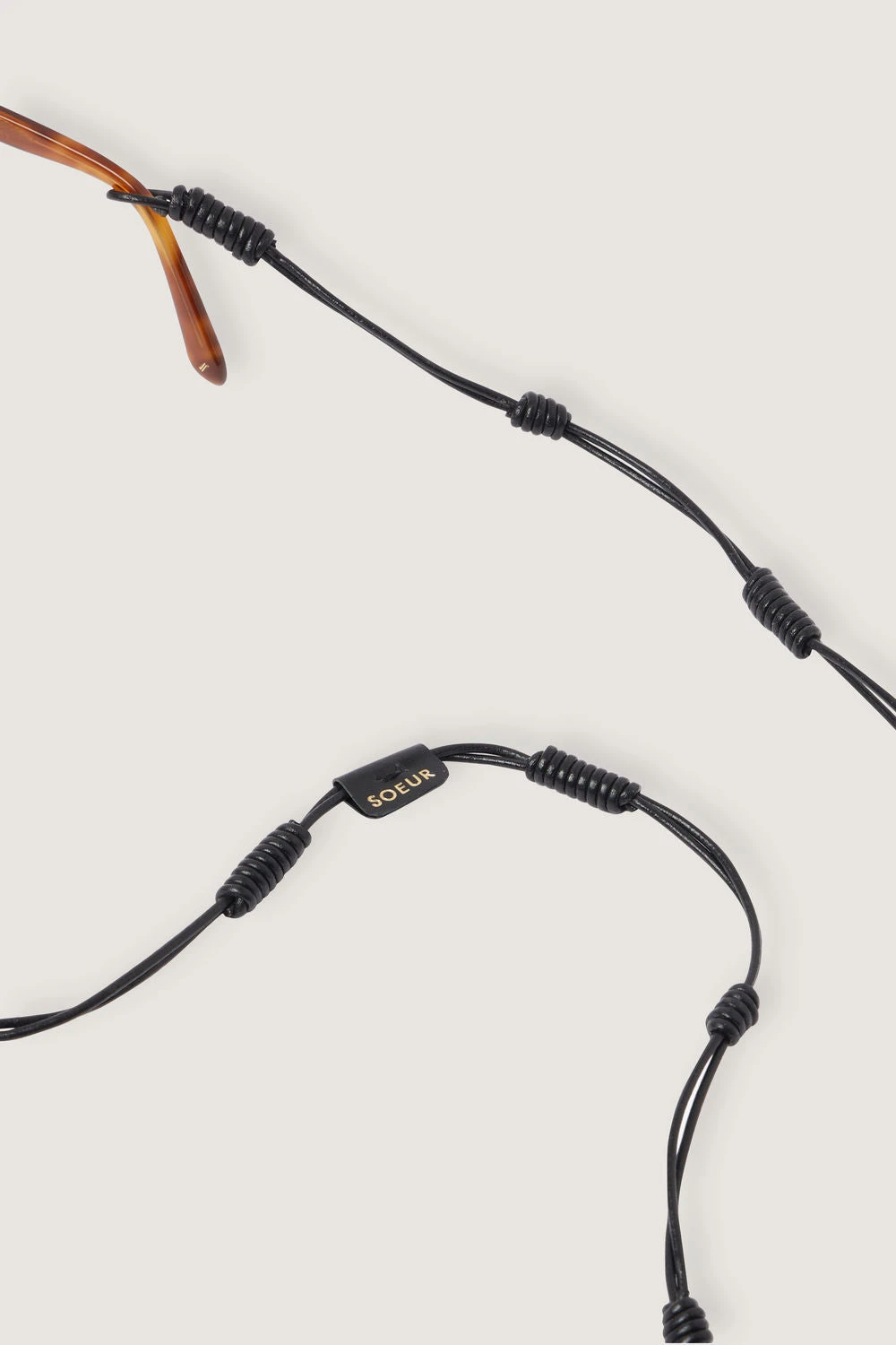 ARNALDO est un cordon à lunettes entièrement constitué de liens en cuir noués à la main façon macramé.