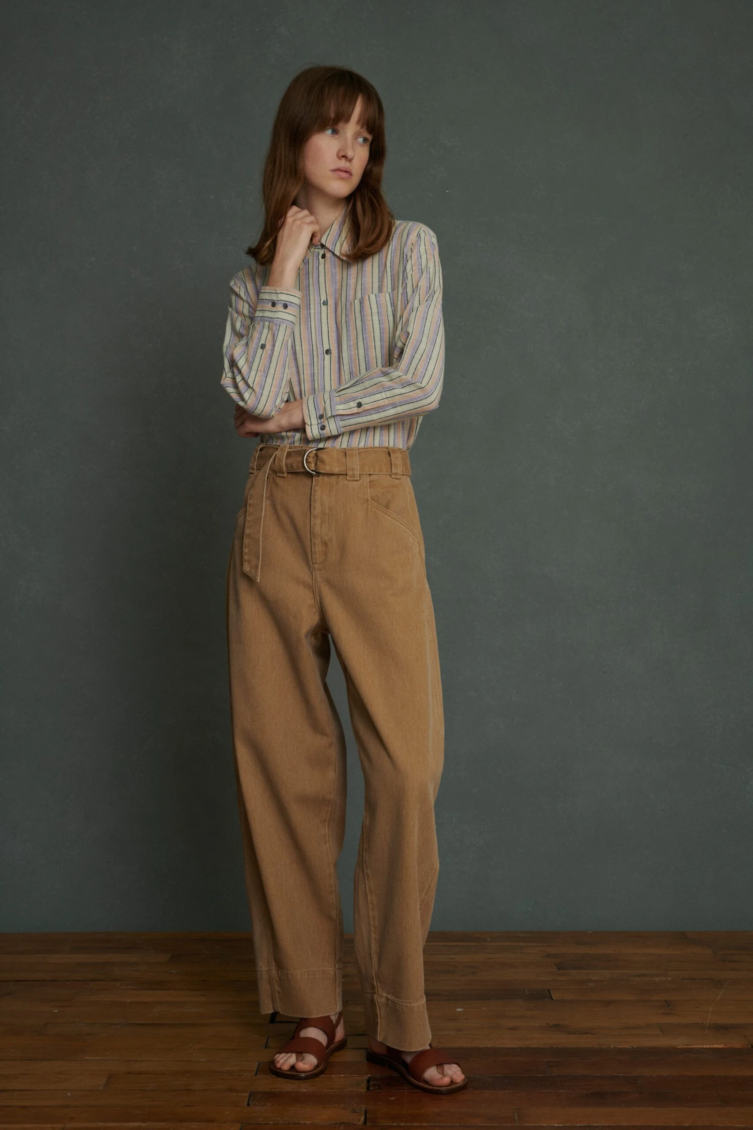 VOLAGE est un pantalon en toile de denim souple. Sa taille haute se resserre grâce à sa ceinture large coulissante. Il est reconnaissable par ses poches à la découpe en biais et sa silhouette arrondie. Les jambes sont volontairement longues pour varier les longueurs et pouvoir le porter retroussé.