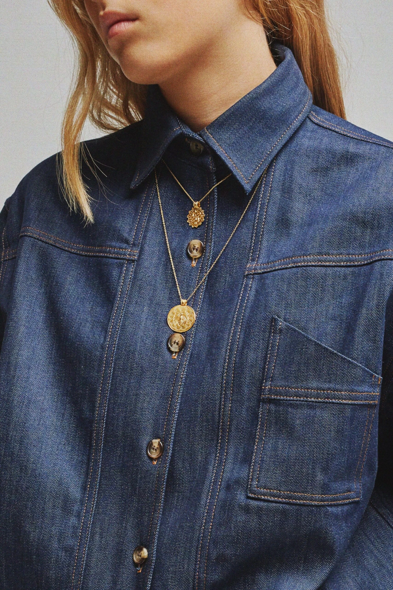 DOMITILLE 2 est un pendentif rond en vermeil décoré d’une hirondelle. Les motifs à l’intérieur de la médaille sont gravés par martelage.