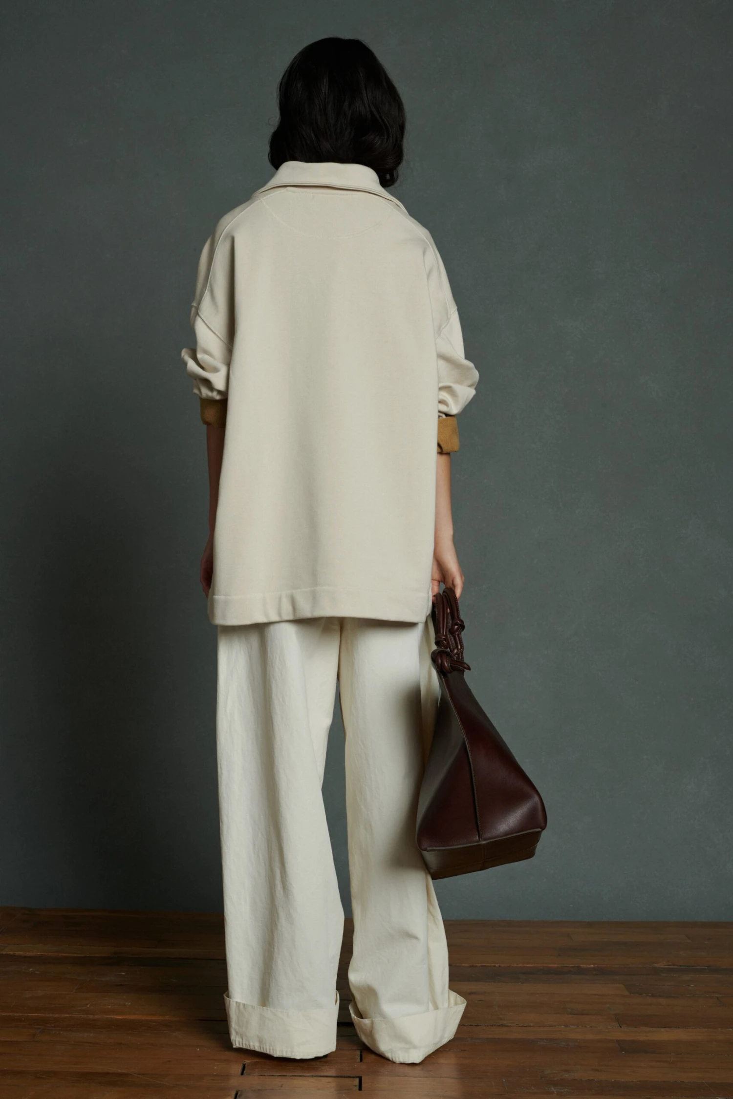 AUREL est un sweatshirt résolument oversize inspirée des vareuses traditionnellement en toile épaisse. En jersey épais « American fleece », l’envers est non gratté dans une couleur miel que l’on peut faire apparaitre en retroussant les manches.